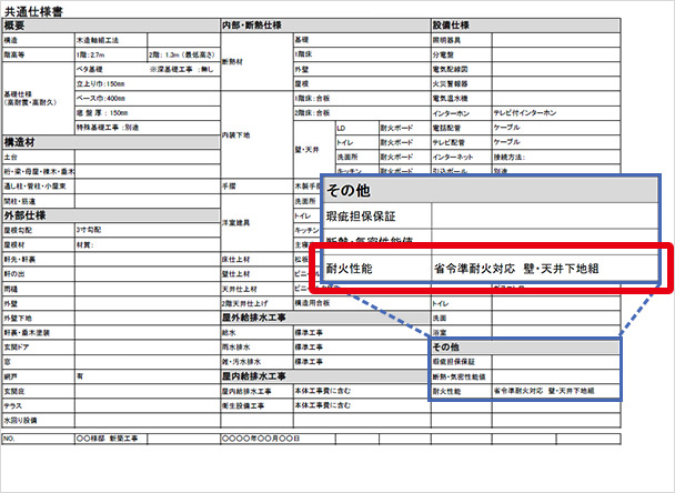 これを証明するための資料で最もおすすめなのは「設計図面」です。図面には、外壁や床等の仕様が小さく書かれていますが、その中に「省令準耐火」という記載があればOKです。